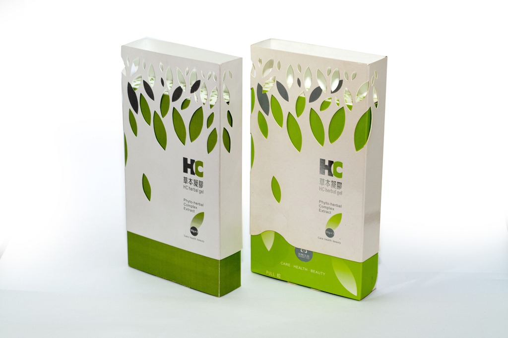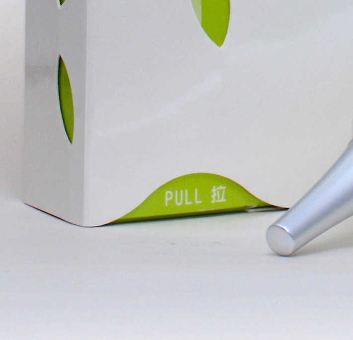 我犯了外科醫生不應該犯的錯誤(左邊),後來補加手指拉開內盒的半圓形(笑ING)。第一次雷射列印經RIP輸出的綠色再到成品我調過顏色讓它更翠綠,雖然雷射碳粉本來就比較不顯色,但在對過色票後我只能說跑過RIP軟體出來的東西,還是準.這輸出的錢花的值得。