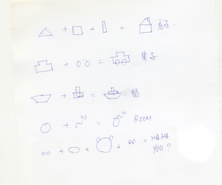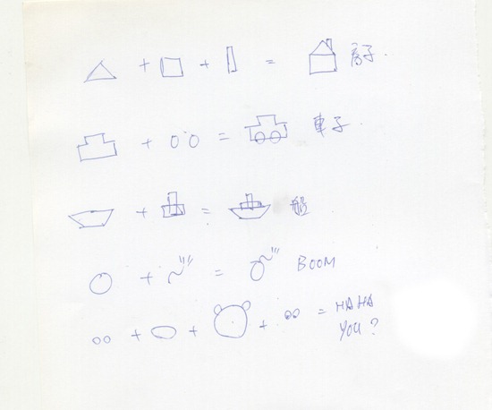 還記得我們小時候畫畫,無法將具象的東西畫的很像所以會用抽象的幾何圖形來組合,比如一個三角形加上四方形,如果再加一個長方形那你一定會說"房子"如果再加2條弧線在長方形上面,那打死你都會拼命說"這一定是房子"一些很具象的東西,早被我們抽象化了,"象形文字"你我都看不懂,但可以猜...........回到最原始也回到最真。